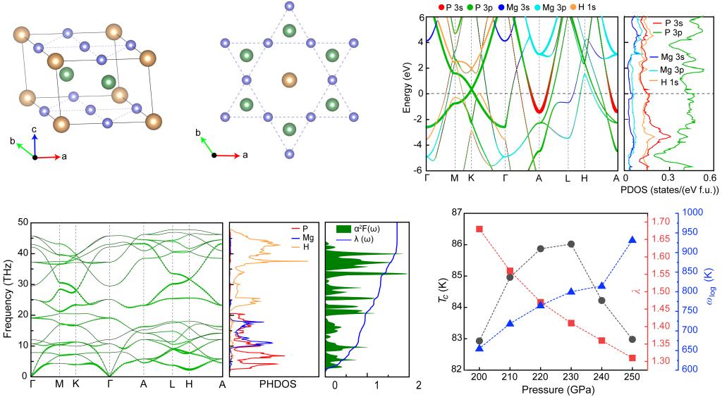 自超导现象发现以来,探寻具有更高超导转变温度的材料一直是凝聚态物理领域的研究热点。张建宁研究团队通过晶体结构预测和第一性原理计算,系统探索了200 GPa下的Mg-P-H三元体系,成功预测出两种稳定的化合物:类笼目结构的MgP2H3和氢笼结构的MgPH6。电子局域函数分析表明,具有类笼目结构的MgP2H3具有共价键与离子键共存的混合键合特征。进一步的电声耦合计算表明,MgP2H3的超导临界温度高达82.93 K,这一数值已突破液氮温度(77 K)。其高温超导性源于费米面附近P-3p、Mg-3p和H-1s轨道电子与光学及声学声子模式之间的强烈耦合。这项研究不仅揭示了Mg-P-H体系是一个具有潜力的高温超导家族,更重要的是,它为在氢化物中设计基于类笼目晶格特征的新型超导材料建立了理论基础,为未来探索更高性能的超导体开辟了新的方向。