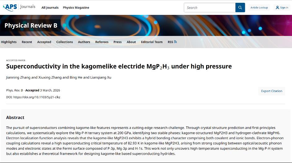 近日,我院张建宁博士的论文《Superconductivity in the kagomelike electride MgP2H3 under high pressure》在国际知名期刊《Physical Review B》上发表。该期刊为中科院SCI物理与天体物理2区期刊,影响因子3.7。我校为第一完成单位,张建宁博士为论文第一作者和唯一通讯作者。原文链接:https://doi.org/10.1103/5y21-clkz。