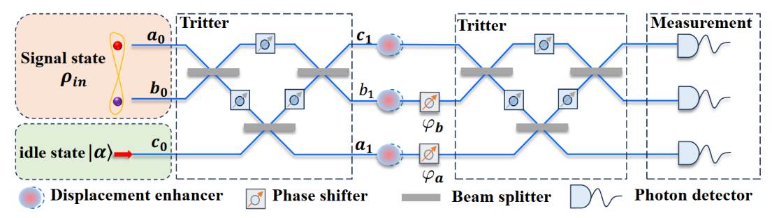 针对这一问题,夏莹等人提出了一种位移增强的干涉测量新方案。该方案基于传统三模线性干涉仪结构,引入三个位移操作(Displacement Operations, DOs),实现对两个独立相位参数的同时估计。理论研究表明,通过优化位移操作的幅值和相位,并增强输入信号态的纠缠特性,可以显著降低单位光子量子 Cramér–Rao 下界,从而提升实际量子光学系统中的测量精度。该成果为实际条件下实现量子增强多参数精密测量提供了重要理论指导,对推动量子传感与量子测量技术的发展具有积极意义。