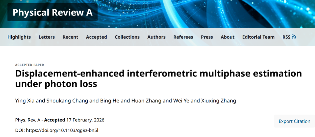 近日我院夏莹博士在量子精密测量研究领域取得重要进展。夏莹博士以第一完成单位、第一作者完成的研究论文《Displacement-enhanced interferometric multiphase estimation under photon loss》,已被国际物理学权威期刊《Physical Review A》正式接收并发表。