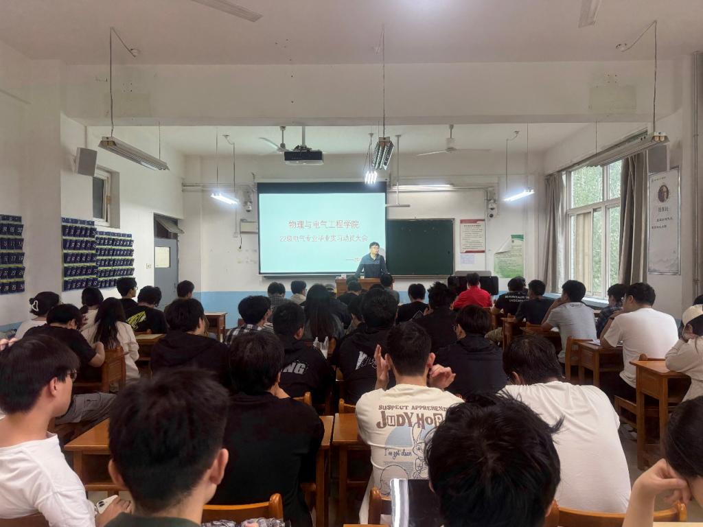为加深学生对毕业实习的认识,明确实习目标,提升实践能力和综合素质,物理与电气工程学院于2025年9月5日在2421教室召开了2022级电气专业毕业实习动员大会。参加本次大会的有副院长何冰、系主任冯洋、许红、张莹、彭程老师,以及电气221班、222班全体学生共100余人。